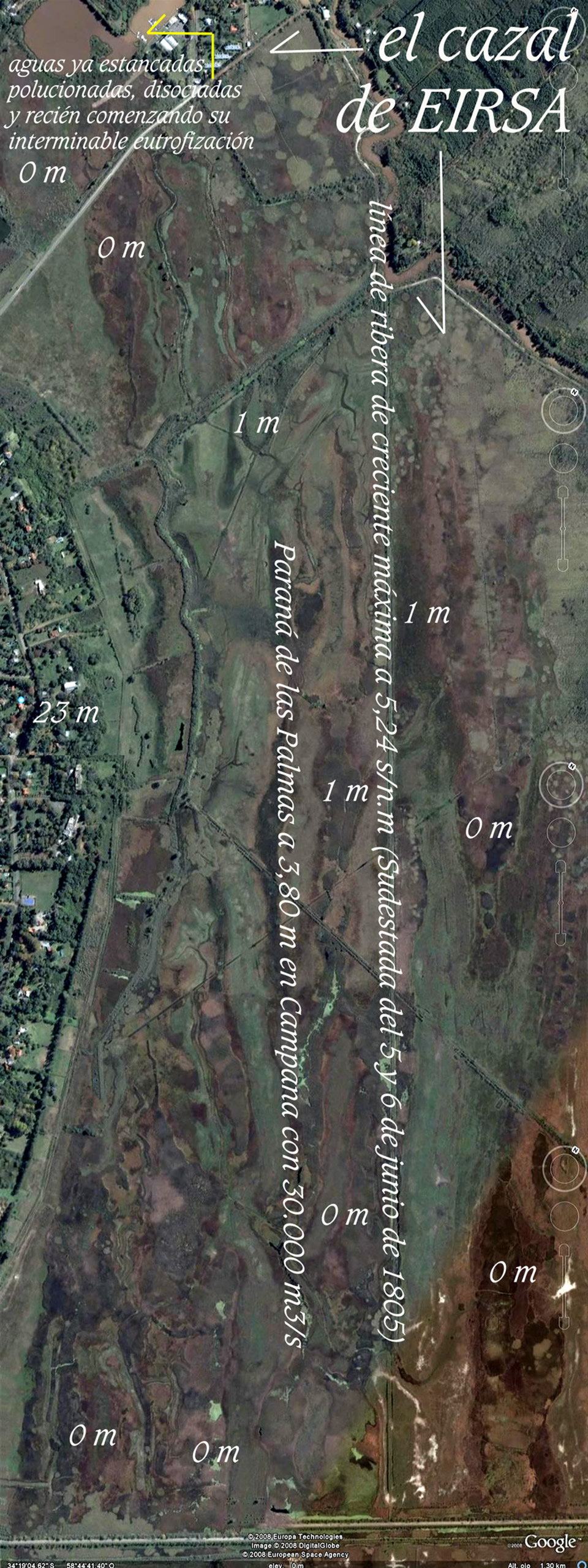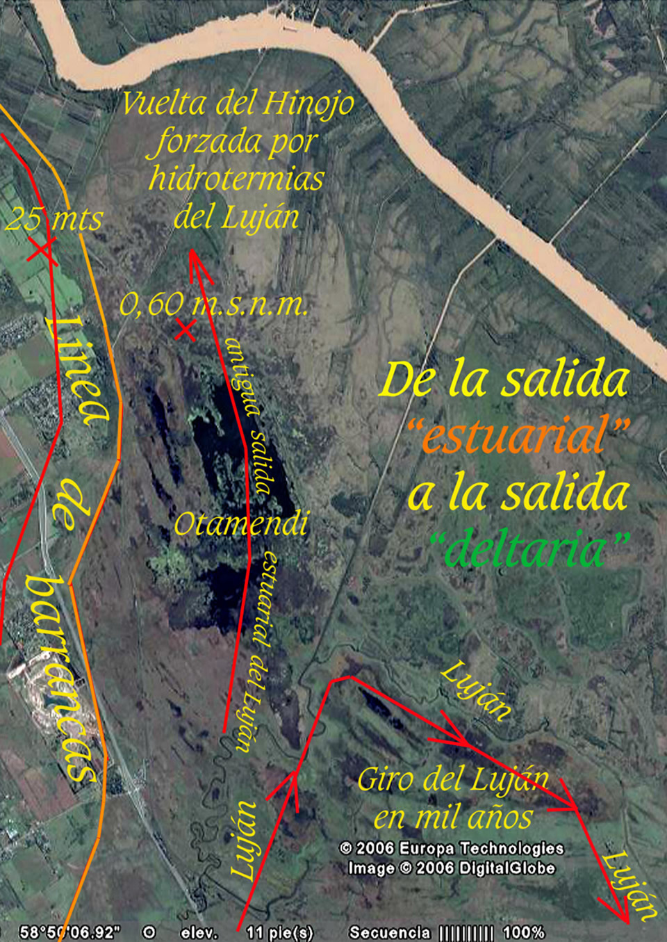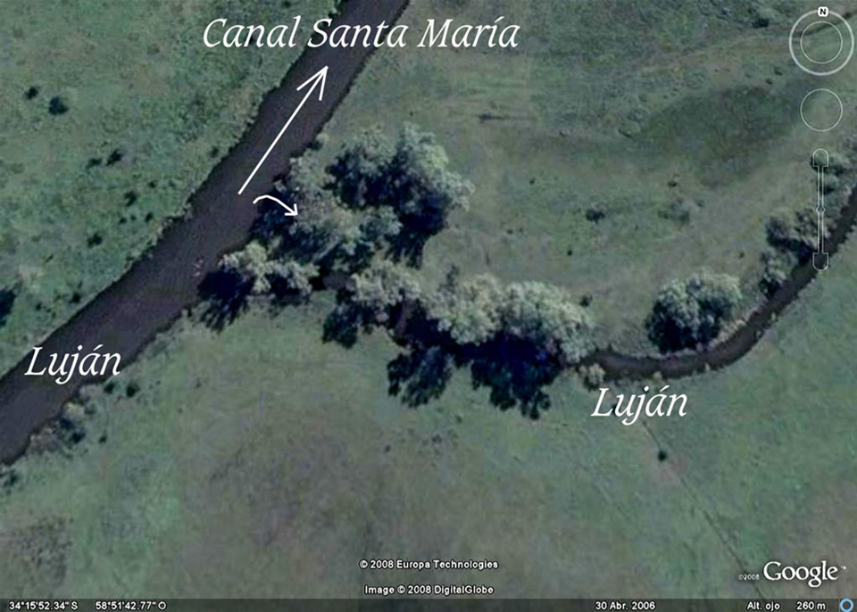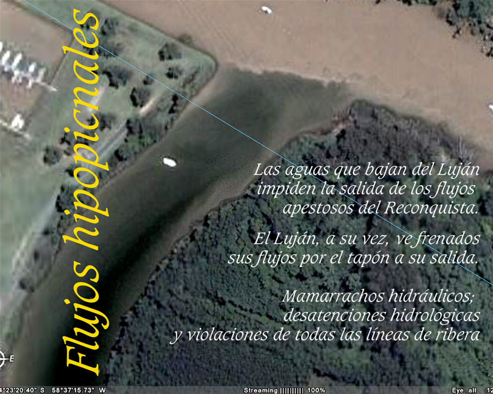 A estas áreas del Luján sus providencias no le fueron jamás ajenas, hasta que los mercaderes descubrieron la forma de hacer los mejores negocios con lo que ellos llaman “los únicos suelos disponibles" (los peores suelos para asentar humanos), e ignorando todas sus funciones naturales arrasaron con ellos. Esta llanura de aprox. 25.000 Has que de Norte al Sur van desde Campana hasta la salida del Reconquista es denominada llanura “intermareal”, poligenética” o interdeltaria” porque a ella concurrían las salidas de los cursos del Luján, del Escobar, del Garín, del Basualdo y del Reconquista; todas ellas con dirección NNO en tanto las aguas del estuario llegaban hasta Campana unos 500 años atrás. Por ello el humedal de Otamendi es parte de los humedales de salida del Luján por la Vuelta del Hinojo a la altura de Campana. Al retirarse las aguas del antiguo estuario por avances del delta del Paraná con sedimentaciones que le son propias en la margen Este del actual curso del Luján, todas las salidas de estos cursos de agua mencionados se vieron forzadas a girar 180° de rumbo. Algunos como el Luján y el Reconquista a duras penas lo lograron. Por ello ambos cursos de agua reclamaron obranzas de auxilio, tal el caso del canal de Santa María por donde hoy escurre la mayor parte del caudal del Luján en directo al Paraná de las Palmas; ver imagen que sigue: y el Aliviador del Reconquista con un grave problema de disociación hidroquímica y térmica en su encuentro con el Luján. Las aguas hipopicnales del Luján tienen todo a su favor y sería necesaria una importante modificación a la salida del Aliviador para intermediar estas diferencias picnales (Gr. picnos: espeso) Los demás quedaron conformando humedales como los llamados Bajos de Mildberg adonde concurren las aguas del Escobar, Garín y Basualdo. Todas estas cuencas naturales que conforman decenas de miles de hectáreas (sólo el Escobar supera las 27.000 Has.) finalizaron su esfuerzo de adaptación al nuevo frente deltario del Paraná que les tapaba su antigua salida estuarial en un formidable humedal que ahora ha sido ocupado por mercaderes que ignoran todo proceso de hidrogeomorfología histórica y ni noticia tienen de dónde irían a parar las aguas de todas esas cuencas que por esos humedales transportadores con extrema lentitud buscaban transformar el nulo recurso hidrodinámico, en ese recurso termodinámico natural que llamamos “convección interna”. Los respetos de esos tránsitos son inefables y no entrarían en mil años en la conciencia de un mercader que sólo mira por el dinero. No sólo se devoraron todos los humedales que encontraron en el camino, sino que bastardearon todas las riberas de todos los cursos de agua grandes, medianos y pequeños. Con mecánica de fluídos estimaron compensaciones a esos estrechamientos de los cursos. Y toda esta cosmovisión meramente hidráulica ignoró los procesos por los cuales una molécula de agua hace camino en pendientes nulas. Los laboratorios de mecánica de fluídos no son funcionales a mirada a termodinámica y por ello todas las modelaciones matemáticas aparecen cargadas de extrapolaciones que desesperan por imaginar el movimiento de esa famosa molécula de agua bendita, que sólo espera la acumulación de calor en los meandros, en las aguas someras y en las llamadas “costas blandas” (sin tablestacados), para encontrar la energía amiga que la transfiera. En condiciones normales los flujos muestran déficits extremos y en condiciones extremas todas las consideraciones hidráulicas fueron estimadas con recurrencias a eventos de tan sólo 10 años, ignorando que la hidrología urbana se funda en recurrencias mínimas de 100 a 500 años. Todos estos procesos en donde la termodinámica impera para nutrir mirada comienzan en el Luján a la altura de la autopista 8, donde el valle se abre a planicie extrema. De allí en más, todo es historia de desatención hidrológica y avidez extrema. Por ello caben estas líneas que siguen con los enfoques legales para sintonizar las inevitables demandas judiciales que sólo ellas orientarán mejores comportamientos.