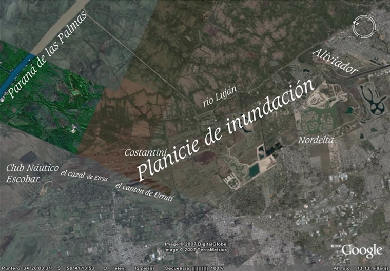 Respecto de los asentamientos humanos en estas planicies, tres aspectos me parecen de comienzo los más importantes a considerar: el que refiere de la fragilidad del manto filtrante del extenso humedal que cubre el acuífero que por allí aflora y cuyas estimaciones ya ha publicado el INA (ver imagen que sigue); la infiltración en los estanques artificiales cavados con gran falta de criterio en el humedal (a pesar de haberles asegurado con bombos y platillos "sustentabilidad hidrológica?!"), de toda la bruta polución del Aliviador del Reconquista; y la vulnerabilidad superlativa que descubren los riesgos de las crecidas del sudeste; al igual que los tributarios estuariales vecinos, incluído el Paraná de las Palmas, que por esta planicie se desparraman sin pedir permiso.